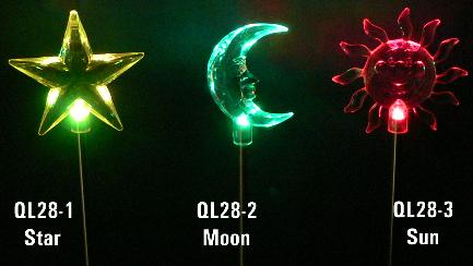 Great Christmas decoration for garden and yard. The perfect gifts for the holiday season! These LED garden stick lights features solar powered super bright LED color changing light, no electric cord wiring, long working hour, durable "plug and play" aluminium stick body , weather-proof super bright LED light bulb. Each light has two solar panels and comes with one AAA Ni-Nh rechargeable battery. LED can light up 10 hours after each fully charged. Item number: QL-28 Solar powered LED garden stick light Stick full length: 32" Ornament size: 2 1/4" to 3" Solar panel holder size: 3 1/2"(diameter) Light color: automatically changing in blue, red, green and mixed color Stick light comes with an "On/Off" button Light ornament available in Star, Moon and Sun Price: $19.95/each stick light Order 2 or more, $17.95/each; mixed ornaments is ok & please state that in the "additional instruction" in shopping cart. Shipping included to 48 U.S. continental states |